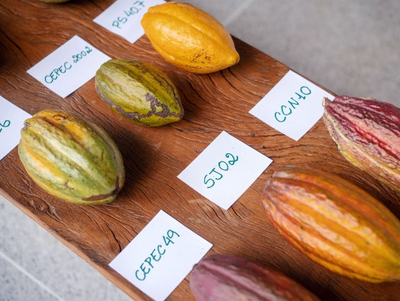 - カカオは⼟壌の成分を取り込むことに⻑けたフルーツです。バナナやシトラスなどのほかのフルーツと混植されることが多く、⼟深くの根っこの部分でそれぞれの⽊がからまることで複雑な味わいになっていきます。