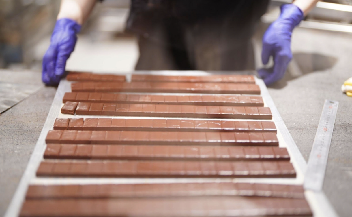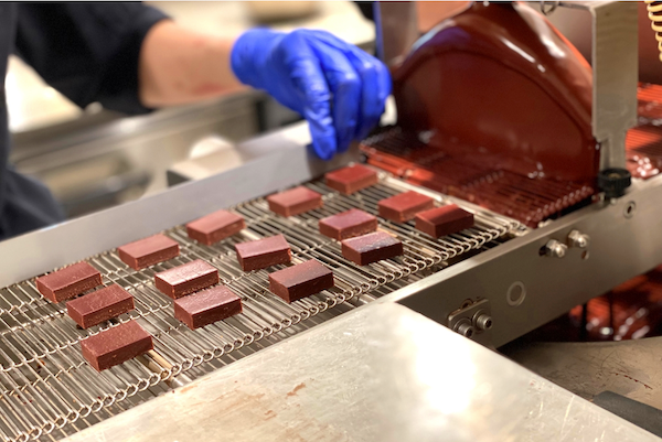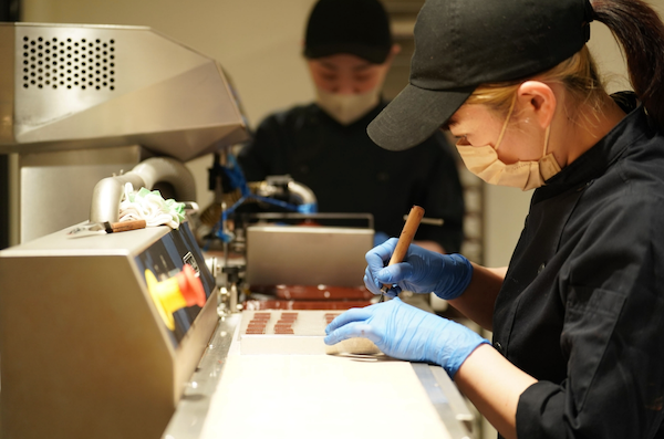 ビーントゥバーチョコレートをまとい、つやつや光るボンボンショコラが次々と生み出されていく。薄く、美しくコーティングされ、程よく軽い食感となめらかな口どけ。greenのボンボンショコラには、ビーントゥバーならではの香りや味わいがぎゅっと詰まっている。