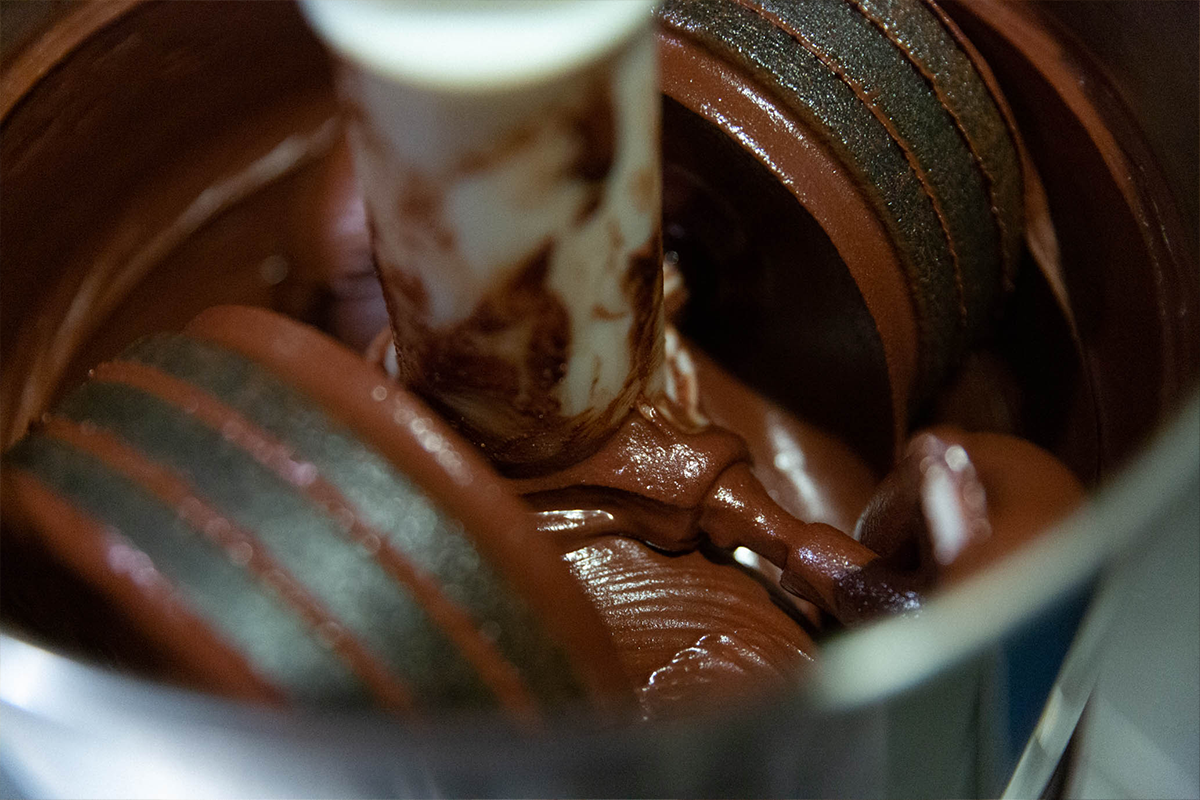 さらに、滑らかな舌触りを目指して、コンチングマシンで48時間から50時間かけて丁寧に石臼挽きをしました。