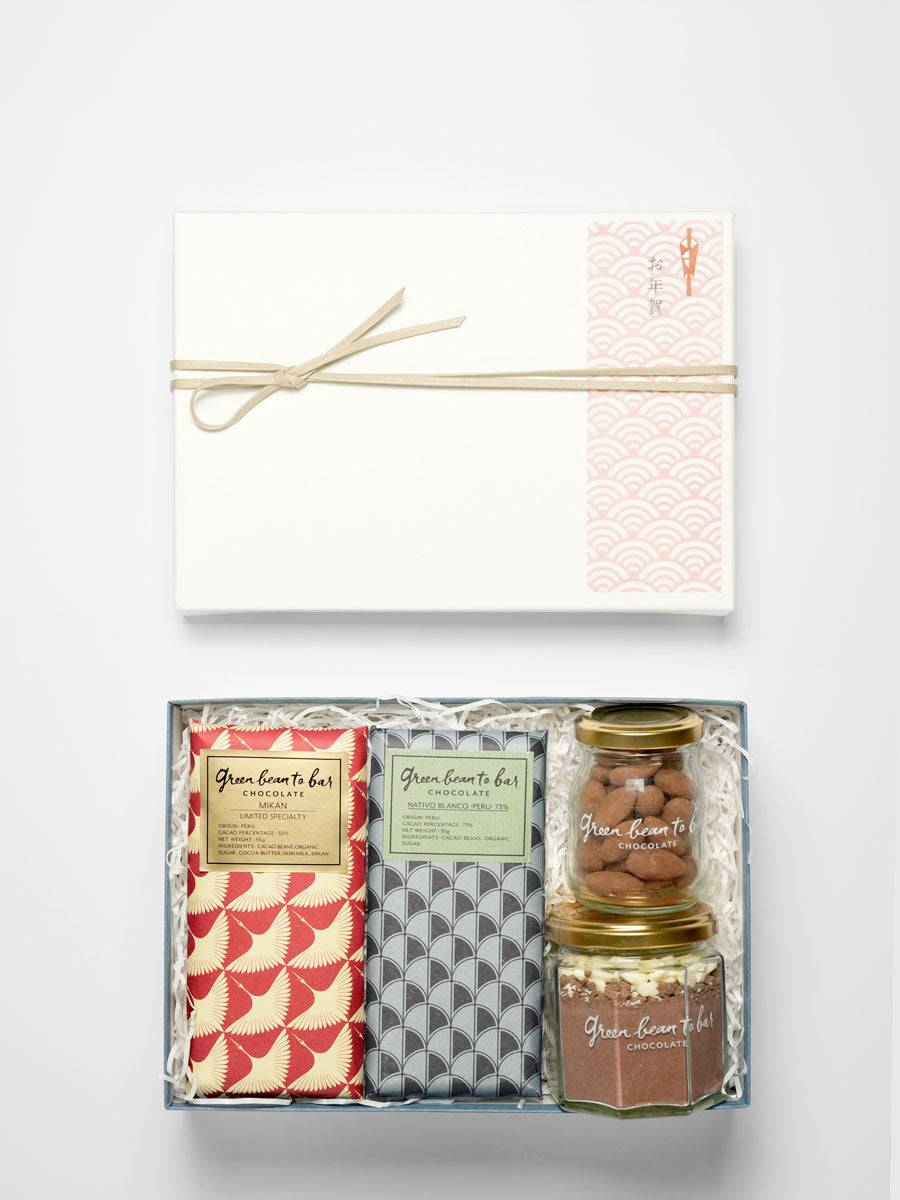 《お年賀期間限定》年始限定の特別なミルクバーと、サロンドショコラパリ(CCC) 最高位受賞のダークバー、アマンドショコラ・ドリンクパウダー加えたアソートボックスです。お年賀の短冊をつけてお送りします。