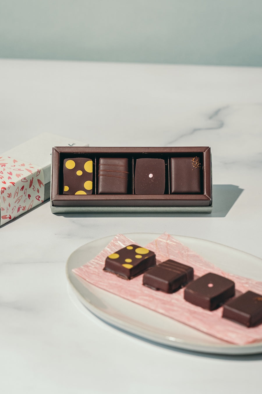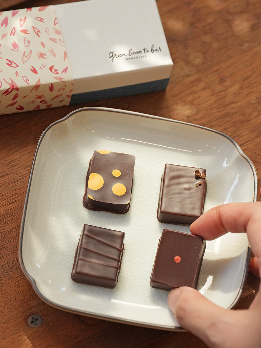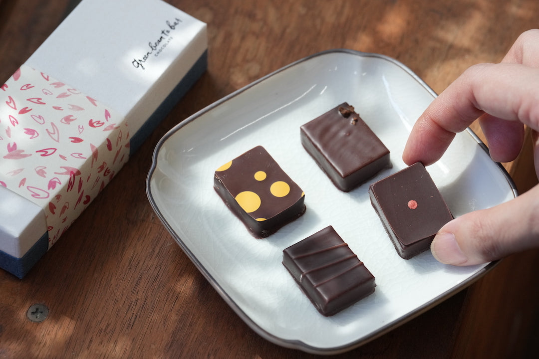- ガナッシュ、プラリネ、コーティングをするビーントゥバーチョコレート。その全てをラボで一から手作りしているgreenのボンボンショコラ。仕込みから箱詰めまで、1週間のサイクルで作られるそれは、じっくり1週間、手間ひまかけてわずか200粒。