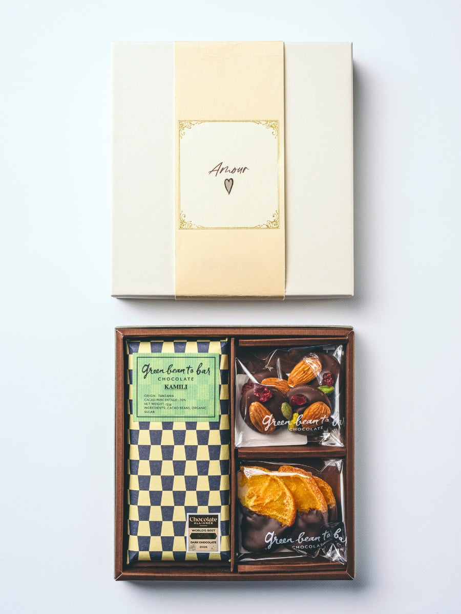 ダークのビーントゥバーチョコレートバーとチョコレート菓子2種が楽しめるギフトボックスです。ビターなチョコレートを楽しみたい方へ。シーズナル限定ラッピングでお届けします。