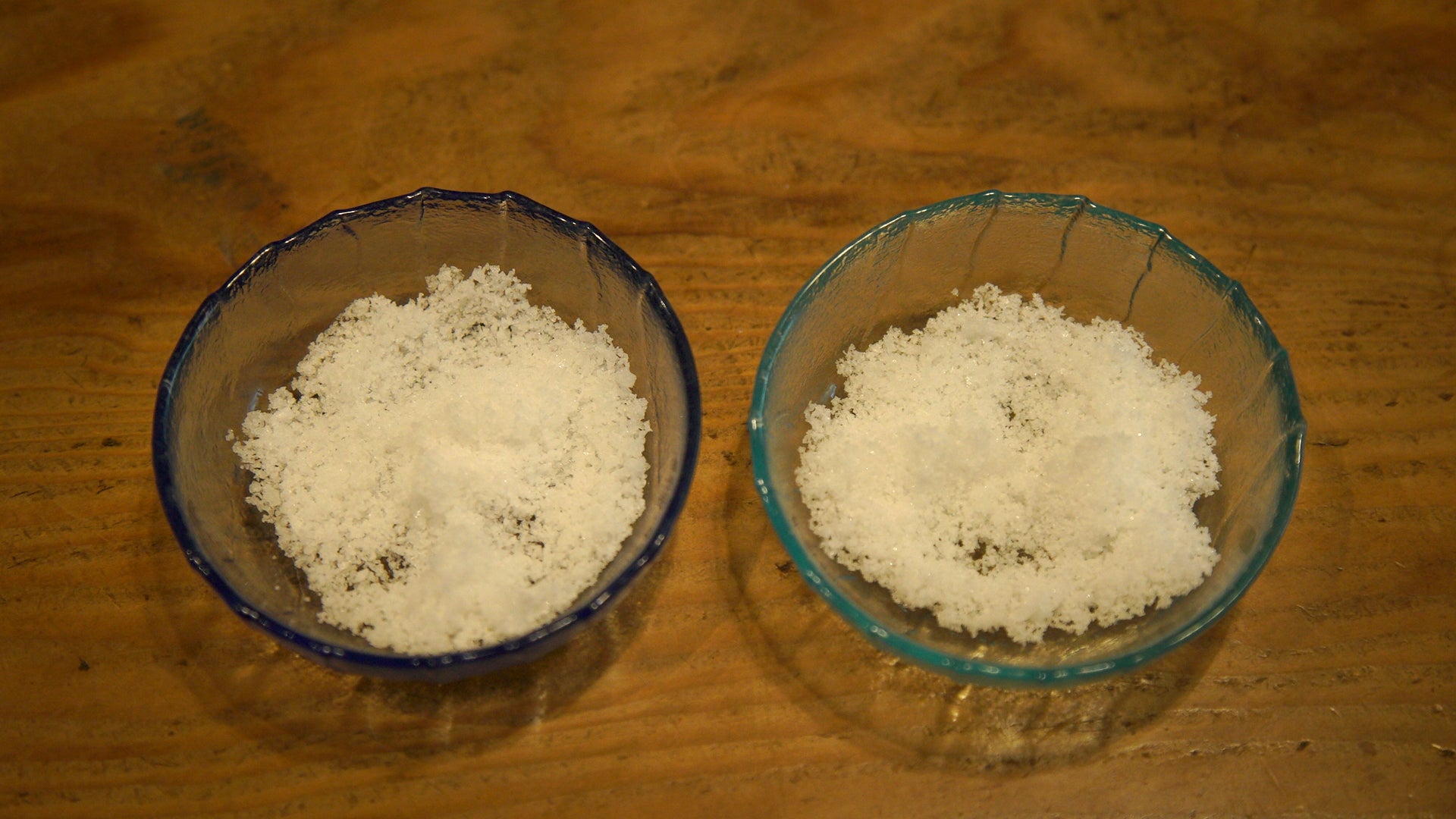 - 地下二百数十メートルから汲み上げたミネラル満点の深層海水は、1代目の阪本章裕さんお手製の巨大ドームにて噴霧をしながら、太陽や風の豊かな自然エネルギーにより、およそ1ヶ月かけて濃縮されていきます。濃度の増した海水は濃縮槽に移し、さらに5分の2以下の体積になるまで、2昼夜かけて濃縮。それを結晶釜で沸騰させると、水面から徐々に結晶化がはじまります。キラキラと輝きを放ちながら結晶化するさまは、「まるで、1ヶ月以上てまひまかけてきたことへの、ご褒美のよう」と、2代目の洋未さん。できた結晶は、遠心分離機にかけることでにがりと分けられ、自然塩ができあがります。