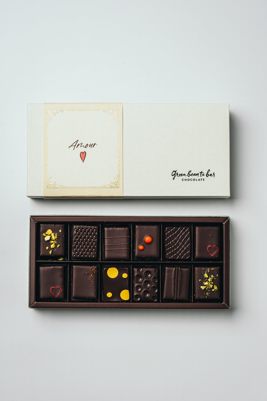 原材料 カカオ豆(ペルー、タンザニア、インドネシア)、オーガニックシュガー、生クリーム、チョコレート、ピスタチオ、カシスピューレ、アーモンド、カカオバター、砂糖、バター、ホワイトチョコレート、セミドライフィグ、フィアンティーヌ、みかんピューレ、パッションフルーツピューレ、転化糖、甘味料(ソルビトール)、水飴、加糖凍結卵黄、脱脂粉乳、生姜、はちみつ、コアントロー、カシスリキュール、コーヒー豆、塩、バニラ、転写紙、ゲル化剤(ペクチン)/トレハロース、酸味料、(一部に小麦・卵・乳成分・アーモンド・大豆・りんごを含む)