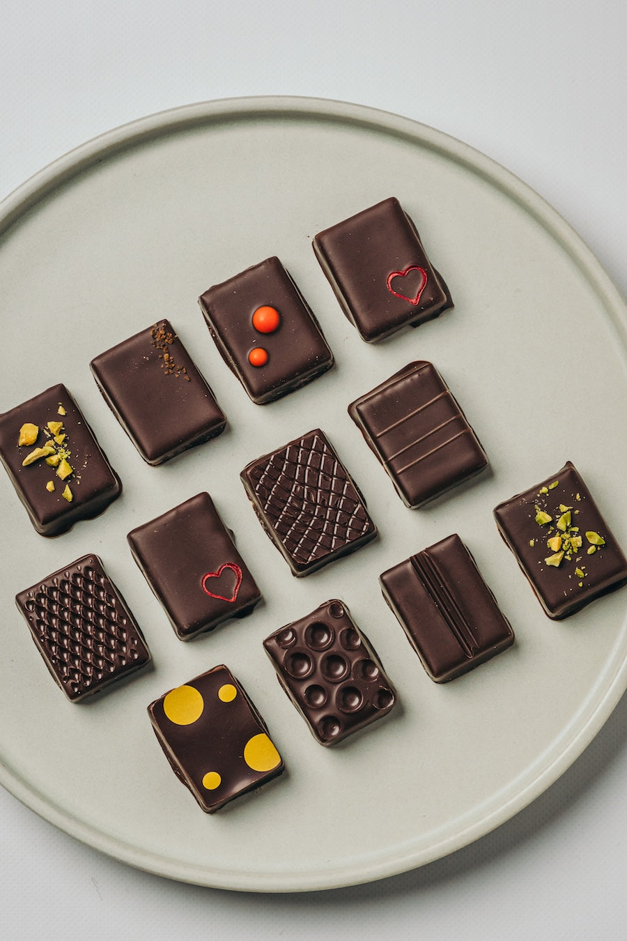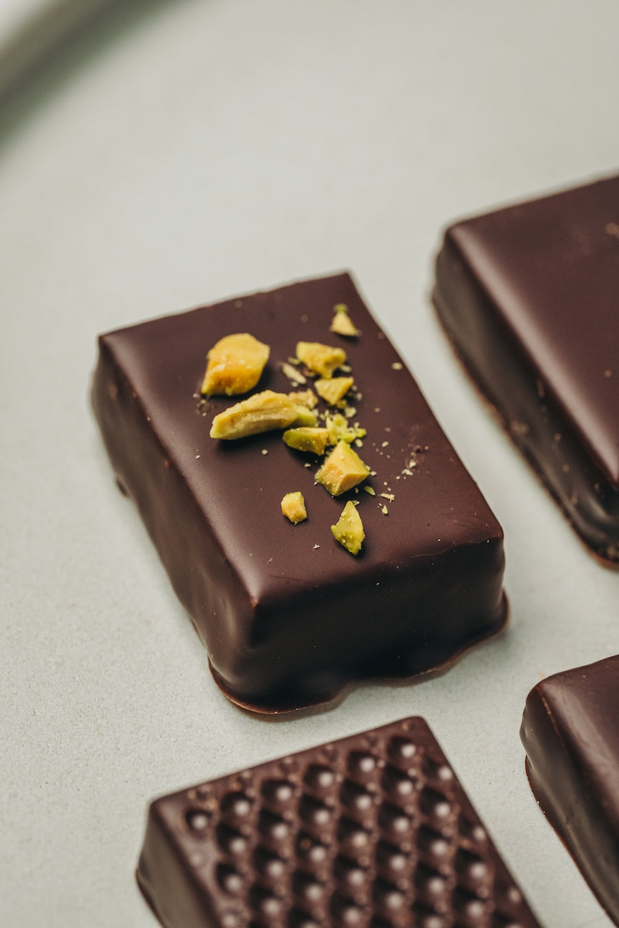 ガナッシュやプラリネからコーティングまで全て手作業によって生まれた“ビーントゥバー”のボンボンショコラ。厚さは口どけと食感をベストに感じられる約10mmに設定。チョコレートバーと同様に産地別のカカオ本来の香りを引き出したガナッシュに、薄く、見た目にも美しいコーティングを施しました。